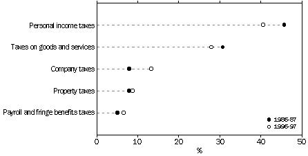 Contributions to total taxation In 1996-97, the combined taxation revenue of the Commonwealth Government, State and local governments in Australia was $163 billion. By far the largest component was personal income taxes which raised $66 billion or 41% of total taxation revenue - up from 35% in 1966-67 but a lower proportion than in 1986-87 when personal income taxes contributed 46% of total taxation revenue. The proportion of total taxation revenue raised by taxes on goods and services has also declined during the decade, from 31% in 1986-87 to 28% ($46 billion) in 1996-97. Of this amount, the two largest components were excises and levies ($14 billion) and sales tax ($13 billion). Company taxes, payroll tax and fringe benefits tax together contributed $32 billion, about half as much as personal income taxes, and represented 20% of total taxation revenue in 1996-97. This is an increase since 1986-87 when these taxes contributed 13% of total taxation revenue, about a third as much as personal income taxes. Property taxes accounted for 9% of total taxation revenue in 1996-97. Fees and fines raised 2% and income taxes levied on non-residents accounted for a further 1% of taxation revenue. NET TAX RATE(a)