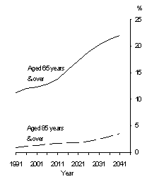 Dependency ratios By the year 2026 the number of aged persons will exceed the number of children. The aged dependency ratio is projected (under series A assumptions) to increase fairly slowly, from 0.18 in 1993 to 0.21 in 2011, then more rapidly to 0.36 in 2041. During this period the child dependency ratio is expected to decline until 2011 and then to stabilise at around 0.29. The decrease in the child dependency ratio implies a decrease in outlays on children's services. However, this will do little to offset the likely increase in outlays associated with ageing, particularly on health services and income support, which are much higher than the outlays associated with children1. In 1993 South Australia had the highest aged dependency ratio (0.20) followed by Tasmania (0.19), New South Wales and Victoria (both 0.18). In 2041 aged dependency ratios are expected to be highest in Tasmania (0.43), South Australia (0.42), and Victoria (0.40) (see Population - State summary tables). PROJECTED DEPENDENCY RATIOS (SERIES A) Source: Population Projections, 1993-2041: Series A; Estimated Resident Population The aged population The aged population is expected (under series A assumptions) to grow from 2.1 million in 1993 to 5.5 million in 2041, increasing as a proportion of the total population from 12% in 1993 to 22% in 2041. The largest increases (of about 98,000 a year) are projected to occur during 2011-31 as survivors of the 'baby boom' generation (born in the late 1940s to 1960s) reach retirement age. The number of persons aged 85 years and over is projected to increase by an average of 10,000 a year until 2026 (except during 2016-21 when the very low birth rates of the 1930s depression are echoed in this cohort), and then by an average of 26,000 a year during 2026-41. Women have a longer life expectancy than men (see Health - National summary tables) and therefore outnumber men in the older age groups. In 1993 there were 76 men for every 100 women aged 65 years and over. By 2041 the aged sex ratio is expected to be 79, reflecting a prospective reduction in the gap between male and female life expectancy. For persons aged 85 years and over the sex ratio is projected to increase from 42 in 1993 to 50 in 2041. In 2041 women are expected to be 56% of the aged population and 67% of persons aged 85 years and over. South Australia has the oldest age structure of all States and Territories, a situation expected to remain unchanged well into the next century. By 2041, the aged are projected to represent 25% of the State's population, and children 15%. The aged are also projected to represent 25% of Tasmanians, and children 16%. In both States persons age 85 years and over are projected to account for over 4% of the population compared to the national average of 3.5%. Victoria's population is also expected to have a relatively old age profile in 2041 while New South Wales will remain close to the national average. PROJECTED AGED AS A PROPORTION OF THE POPULATION (SERIES A) Source: Population Projections, 1993-2041: Series A; Estimated Resident Population AGE DISTRIBUTION OF THE PROJECTED POPULATION (SERIES A), 2041