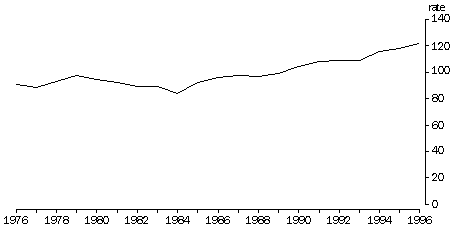 During June 1996, there was a daily average of 16,806 prisoners in Australian prisons, up from 11,243 in June 1986 and 8,840 in June 1976. Imprisonment rates have also increased, from 91 persons for every 100,000 adults in the national population in 1976 to 96 persons in 1986 and 122 persons in 1996.