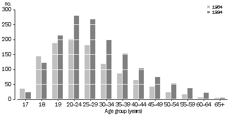 The general increase in the rate of imprisonment over the period from 1984 to 1994 occurred in almost every age group, and was particularly marked for those aged over 19 years. Against this trend, the rate of imprisonment was a little lower for those aged 17-18 years in 1994 than was the case in 1984, and only slightly higher for those aged 19 years. This decrease could be accounted for by the wider range of corrective service options available for young offenders.