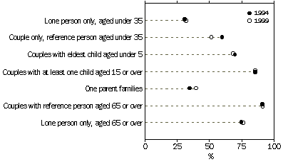 Between 1994 and 1999, the home ownership rates of various life-cycle groups showed little change. However, there were two exceptions. For young couple households without children, home ownership fell from 60% in 1994 to 52% in 1999, while home ownership for lone-parent families increased over the period (from 35% to 40%). There are long-term benefits in home ownership. Initially, the cost of home purchase is often far greater than renting (due to the costs of deposits and fees, as well as ongoing mortgage repayments). However, the much lower costs associated with owning a home outright and the investment that a home represents, can be major factors in the ongoing economic wellbeing of many Australians, particularly as many retire on considerably reduced incomes. PROPORTION OF HOME OWNERS BY SELECTED LIFE-CYCLE GROUPS Source: ABS 1994 and 1999 Australian Housing Surveys. In 1999, the average weekly housing cost for all households was $129. Outright owners (those without a mortgage) had the lowest average weekly housing costs ($47), while those with a mortgage had the highest costs, spending an average of $228 per week (although some of the cost for this group reflects the fact that 54% of these households chose to pay more than their minimum mortgage repayment). On average, those households which were renting paid $146 per week in housing costs. Most Australian households live in separate houses (80% in 1999). However, as with tenure, the type and size of dwellings and housing costs vary across different life-cycle groups.