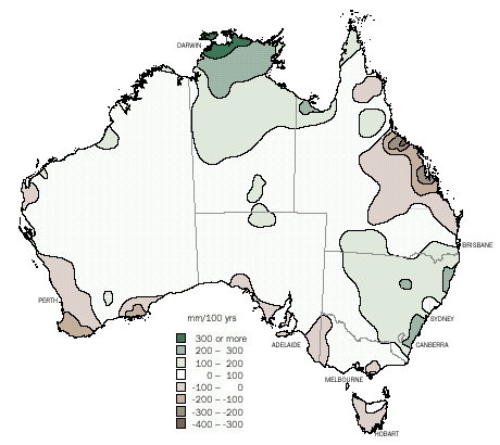 The weather and climate of the twentieth century The twentieth century began with Australia still in the grip of the Federation Drought. It witnessed several extended periods of drought and flood associated with the irregular fluctuations of the Southern Oscillation (graph C2.6), many dramatic individual weather events in all States and a gradual overall warming trend across the continent. The general features of the twentieth century climate have been described in various publications (Bureau of Meteorology 1989; Zillman 1994; Bureau of Meteorology 2001). Some of the more notable individual events and trends in Australian weather and climate over the century are described in the following pages. C2.6 Annual values of the Southern Oscillation Index (SOI), a measure of fluctuations in the surface pressure difference between Tahiti and Darwin and a useful indicator of the broadscale controls on Australian weather. Rainfall The average annual rainfall over Australia from 1900 to 1999 is shown in graph C2.7 along with an eleven year running mean. The very dry period following Federation and the above average rainfall in the 50s and 70s are clearly evident. Overall, there is a very weak rising trend in total rainfall during the century, although individual districts have experienced much stronger trends, both positive and negative, as shown in map C2.8. C2.7 Averaged annual mean rainfall (mm) over Australia, 1900-99. The solid line shows the eleven year running mean. C2.8 The spatial pattern of trends in annual mean rainfall over Australia 1900-99 in mm per century. The maps comprising figure C2.9 show the distribution of rainfall over the continent in terms of the three terciles - above average, near average and below average - for each decade in the period 1901 to 1999.
