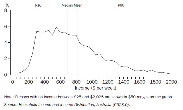 While the average equivalised disposable household income of all households in Australia in 2007-08 was $811 per week, the median (i.e. the midpoint when all people are ranked in ascending order of income) was lower at $692 per week. This difference reflects the typically asymmetric distribution of income where a relatively small number of people have relatively high household incomes, and a large number of people have relatively lower household incomes (graph 9.5). 9.5 Distribution of equivalised disposable household income - 2007-08 Percentile ratios are one measure of the spread of incomes across the population. To illustrate the full spread of the income distribution, the percentile ratio needs to refer to points near the extremes of the income distribution, for example, the P90/P10 ratio. P90 (i.e. the income level dividing the bottom 90% of the population from the top 10%) and P10 (i.e. dividing the bottom 10% of the population from the rest) are shown in graph 9.5. In 2007-08, P90 was $1,360 per week and P10 was $317 per week, giving a P90/P10 ratio of 4.30. Various percentile ratios for selected years are shown in table 9.6, and the changes in these ratios can provide a picture of changing income distribution over time. Another measure of income distribution is provided by the income shares going to groups of people at different points in the income distribution. Table 9.6 shows that, in 2007-08, 10.1% of total equivalised disposable household income went to people in the 'low income' group (i.e. the 20% of the population in the second and third income deciles), with 40.5% going to the 'high income' group (represented by the 20% of the population in the highest income quintile). The Gini coefficient is a single statistic that lies between 0 and 1 and is a summary indicator of the degree of income inequality. Values closer to 0 represent a lesser degree of inequality (if 0, then all household incomes would be equal), and values closer to 1 represent greater inequality (if 1, a single household would have all the income). The smaller the Gini coefficient the more even the distribution of income. For 2007-08, the Gini coefficient was 0.331, up from 0.314 in 2005-06. Some of the changes in the income distribution measures between 2005-06 and 2007-08 reflect the improvements introduced in the 2007-08 cycle.