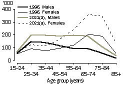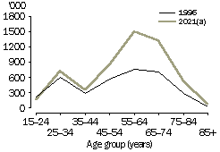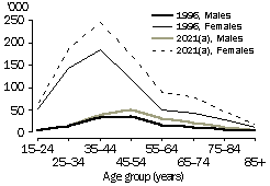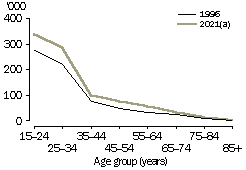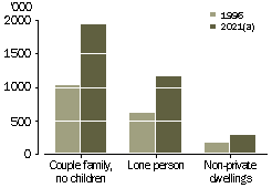 Source: Household and Family Projections, Australia, 1996 to 2021 (cat. no. 3236.0). Older people As a result of population ageing, greater numbers of people are projected to be aged 65 years and over in the future. Consequently, large increases are projected across all living arrangements for people in this age group. Most commonly, older people are projected to be living in couple families without children in 2021 (48%). This is associated with converging life expectancy at birth of men and women. The gap between men's and women's life expectancy declined from seven to six years between 1980-1982 and 1997-1999, which suggests that there will be more older couples in the future.1 Despite this, a tendency for women to outlive their partners is projected, with 21% of people (around 837,000) aged 65 years and over projected to be women living alone in 2021, compared with 8% (around 334,000) to be men living alone. The proportion of older people living in non-private dwellings (such as nursing homes and hostels) is projected to stay much the same between 1996 and 2021, at around 7%. In contrast, due to population growth, the number of older people living in non-private dwellings is projected to increase, from about 157,000 in 1996 to around 293,000 in 2021. SELECTED LIVING ARRANGEMENTS OF PEOPLE AGED 65 YEARS AND OVER (a) Series B projections. Source: Household and Family Projections, Australia, 1996 to 2021 (cat. no. 3236.0). Future housing needs Changing patterns in living arrangements and family composition will have a number of implications for future housing needs. As living arrangements diversify, the demand for housing can be expected to be more diverse. The ageing of the population, and particularly the projected numbers of older people living alone, may lead to the need for more single unit accommodation suited to older people. Extra public housing may be required to meet this need, as there may be more divorces which may impact on people's economic security in old age.2 In addition, if the average size of households continues to decrease, then there may be an increased demand for smaller houses. However, the proportion of households with four or more bedrooms has increased from 18% to 23% between 1988 and 1999.3 This may be associated with greater proportions of young adults living at home, leading to a growing demand for houses with separate space for parents and children. Equally, it could be associated with lifestyle aspirations for large, spacious housing. The wellbeing of individuals is tied to the support they receive from family and other social networks. For this reason, communities of the future may ideally have a range of housing types, to allow family members at different stages of the life cycle to live in relatively close proximity to one another.4 Endnotes 1 Australian Bureau of Statistics 1985, Deaths, Australia, 1984, cat. no. 3302.0, ABS, Canberra; and Australian Bureau of Statistics 2000, Deaths, Australia, 1999, cat. no. 3302.0, ABS, Canberra. 2 de Vaus, D. 1997, 'Ageing' in Australian Family Profiles: Social and Demographic Patterns, eds de Vaus, D. and Wolcott, I., Australian Institute of Family Studies, Melbourne. 3 Australian Bureau of Statistics 1990, 1988 Housing Survey, cat. no. 4133.0, ABS, Canberra; and Australian Bureau of Statistics 2000, Australian Housing Survey, 1999, cat. no. 4182.0, ABS, Canberra. 4 McDonald, P. 1995, Families in Australia: A Socio-demographic Perspective, Australian Institute of Family Studies, Melbourne.