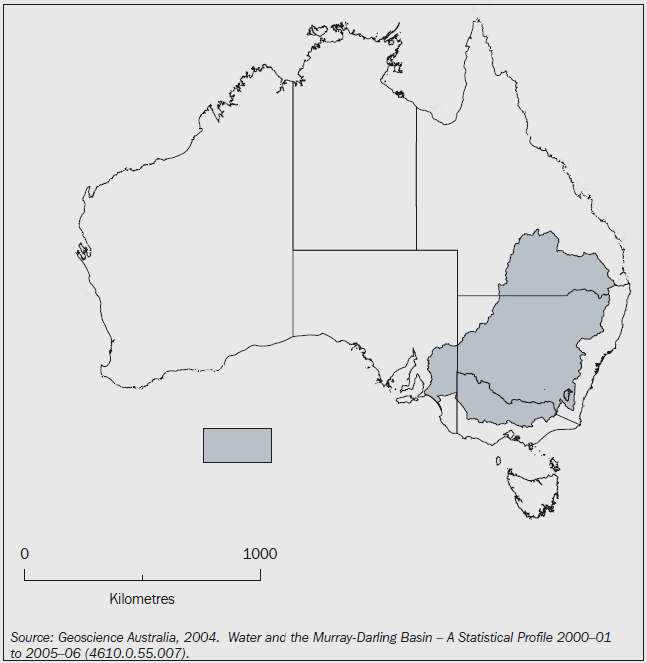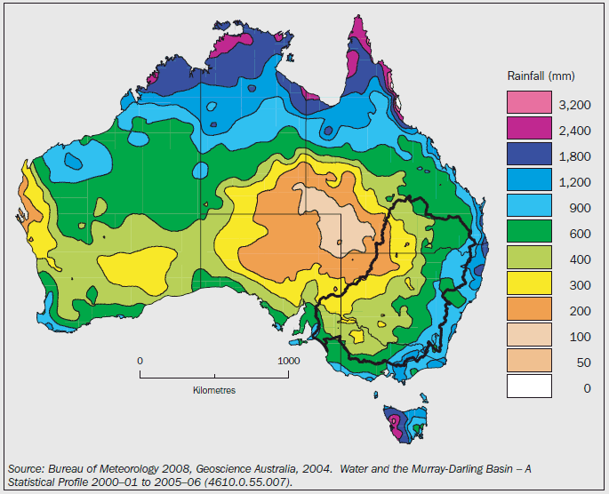 FEATURE ARTICLE: MURRAY-DARLING BASIN The climate of the Murray-Darling Basin is relatively dry compared to other regions of Australia (map 3.18). Annual rainfall in 2005-06 was lower in the Murray-Darling Basin than in the tropical north, eastern seaboard and south-west of the continent, as well as in Tasmania. However, most of the Basin received more rainfall than central Australia. Based on long-term averages, the Murray-Darling Basin receives 530,618 GL of annual rainfall. Of this, 94% evaporates or transpires, 2% drains into the ground, and the other 4% becomes run-off (table 3.19).