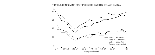 The proportion of people who reported eating fruits declined from 77% of 2-3 year olds to a low of 37% for the 19-24 year age group but increased to 73% of those aged 65 years and over. Females were more likely to have eaten fruits than males in all age groups, except for 2-3 year olds. (Table 3.) Females aged 12-64 years also had a higher mean intake of fruit products and dishes than males, although generally males had a higher