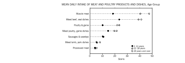 • Adults in Tasmania had the highest mean intake of muscle meats and the lowest mean intake of most other meat, poultry and game products and dishes compared to the other States and Territories (excluding the Northern Territory). (Table 4.)