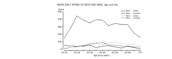 Overall, about 42% of men and 24% of women reported consuming an alcoholic beverage. The proportion was highest in those aged 45-64 years at 49% for men and 29% for women. Males were more likely than females to have consumed alcoholic beverages in every age group. Men also had a much higher mean daily intake of alcoholic beverages than women. Based on mean intake, beer was the main alcoholic beverage for men of all ages and for women aged 16-24 years, while wine was the main alcoholic beverage for women aged 25 years and over. (Tables 1 and 3.)