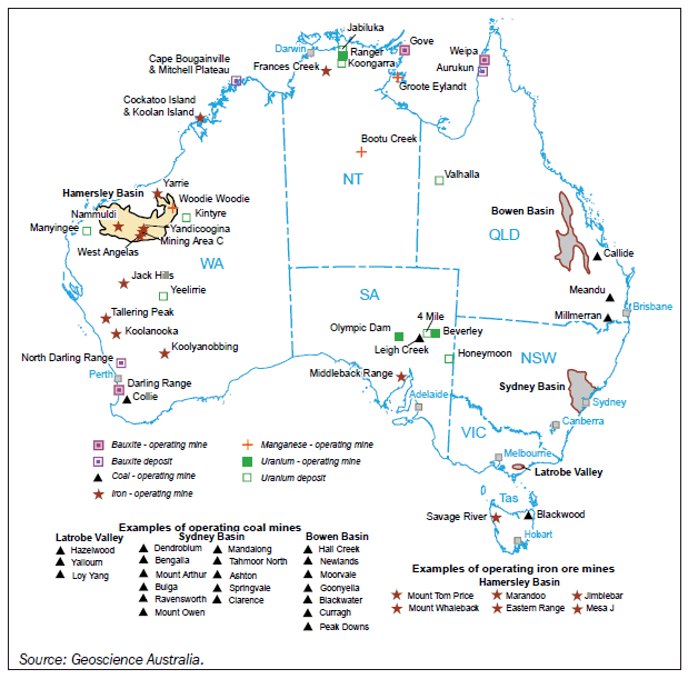 These properties enable copper to be used in a wide range of applications. The largest use of copper is in the electrical industry where copper wire and cable account for about half of the world’s copper production. Other major markets are the motor vehicle and construction sectors. Copper is also an integral part of the expanding information technology sector and is used in the manufacture of computers, mobile phones, fax machines and televisions. Major Australian copper mining and smelting operations are at Olympic Dam (South Australia) and Mt Isa (Queensland), with smaller projects in New South Wales, Queensland, Western Australia and Tasmania. Australia’s EDR of copper at the end of 2008 was 78 Mt, giving it the world’s second largest holding of copper EDR with 13% of the total. Mine production of copper in 2007 was 871 kilotonnes (kt) of contained copper, similar to that in 2006 (875 kt). Queensland dominated Australian production with 376 kt (largely from Mt Isa). This was 7% more than in 2006. South Australia regained the second largest producer position over New South Wales despite a decrease of 3% to 179 kt. Olympic Dam produced all of South Australia’s output, contributing 21% of national production. New South Wales produced 168 kt in 2007, 19% less than in 2006 and mostly from Cadia Ridgeway and Northparkes. Western Australia produced 118 kt, up 14%, and Tasmania produced 30 kt, down 3%. As a producer, Australia's copper mine production ranked fifth in the world in 2007, with 6% of world output, after Chile (37%), the United States of America and Peru (both 8%) and China (6%). Diamond Diamond is composed of carbon, and is the hardest known natural substance, although a sharp blow can shatter it. Diamonds occur naturally but are extremely rare compared with other minerals. Diamonds are thought to form deep in the earth at high temperatures and pressures and are carried to the surface or near surface by volcanic rocks in narrow cylinder-like bodies called 'pipes'. A large proportion of industrial diamond is manufactured, and it is also possible to produce synthetic diamonds of gem quality. Uses for diamonds include jewellery, computer chip manufacture, drill bit facing, and stone cutting and polishing. A diamond's mass is measured by carat weight, with one carat (c) defined as 0.2 grams. Australia produced 19 million carats (Mc) of diamonds in 2007, making it the world's fourth largest producer of diamonds by weight after Russia, Botswana and Congo. It is the third largest producer of industrial grade diamonds after Congo and Russia, and the fourth largest producer of natural gem/cheap gem diamonds after Russia, Botswana and Canada. Australia's EDR at the end of 2008 of gem/near gem diamonds was 92 Mc and industrial diamonds 96 Mc. Australia's EDR of industrial diamonds is ranked third in the world, with 16% of world EDR. Australian production was almost entirely from Rio Tinto Ltd’s Argyle mine in the Kimberley region of Western Australia, which produced 19 Mc. Argyle production is mostly industrial and cheap diamonds. Due to lower grades, production was 36% less than in 2006 despite a 2% increase in the volume of ore treated. Production from the Ellendale mine in the West Kimberley region increased to 475,735 c in 2007, up from 213,000 c in the previous year. Ellendale is noted for high-value fancy yellow gem diamonds. Gold Gold has a range of uses but the two principal applications are as an investment instrument and in the manufacture of jewellery. Secondary uses, in terms of the amount of gold consumed, are in electronic and dental applications. Gold resources occur and are mined in all Australian states and the Northern Territory. Australia’s EDR of gold (at the end of 2008) was 6,255 tonnes, the second largest in the world after South Africa. Australian gold mine production in 2007 (reported by ABARE) was 245 tonnes. This level of production made Australia the third largest mine producing country in the world in 2007, after China (281 tonnes) and South Africa (270 tonnes). Australia’s largest producer in 2007 was the Telfer operation in Western Australia where 19 tonnes (0.62 million ounces) was produced. Telfer was followed by the Super Pit at Kalgoorlie where production was almost 19 tonnes (0.61 million ounces) and Sunrise Dam which produced just under 19 tonnes (0.60 million ounces). In 2007, Western Australia dominated Australian production with 155 tonnes, just under two-thirds of total Australian output. Iron ore Iron ore is the source of primary iron for the world's steel industries. Around 97% of Australian iron ore production occurs in the Hamersley Basin (Western Australia). Small production also comes from elsewhere in Western Australia, Tasmania, South Australia and New South Wales. Australia’s EDR in 2007 was about 13% of world EDR. Western Australia has almost all (99%) of Australia's EDR with about 89% occurring in the Pilbara district. In 2007 Australia was ranked as having the fourth largest iron ore holding in the world, after Ukraine (19%), Russia (16%) and China (14%). Australia's production of iron ore in 2007 (reported by ABARE) was 299 Mt, which was around 18% of the world's iron ore, making Australia the world's third largest producer after Brazil (22%) and China (20%). Manganese ore About 90% of the world's production of manganese is used in the desulphurisation and strengthening of steel. Other uses include the manufacture of dry batteries, as a colorant, and as an ingredient in plant fertilisers and animal feed. Manganese ore was mined in the Northern Territory and Western Australia in 2007. Production of manganese ore in 2007 reached 5 Mt, 15% of world manganese ore output, making Australia third behind China (23%) and South Africa (21%). Australian production comes from three mines - Woodie Woodie (Western Australia) and Groote Eylandt and Bootu Creek (both in the Northern Territory). Australia’s EDR of manganese ore, at 181