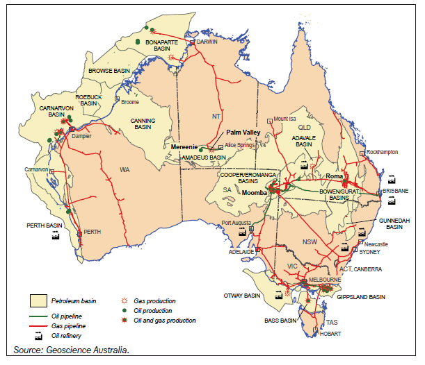 Approximately 16% of uranium EDR is inaccessible for mining. Three uranium mines operated in 2007 - Ranger open cut, Olympic Dam underground mine, and the Beverley (South Australia) in situ leach operations. In 2007, Ranger produced 5,412 tonnes of uranium oxide, Olympic Dam 3,985 tonnes and Beverley 748 tonnes for a total of 10,145 tonnes, 13% higher than for 2006. Australia, with approximately 20% of world uranium production in 2007, is the world’s second largest producer after Canada. Exports of uranium oxide in 2007-08 were 10,139 tonnes, valued at $887m. Exports of Australian uranium are controlled by stringent safeguard conditions which ensure that Australia's uranium is used only for peaceful purposes and does not enhance or contribute to any military applications. These conditions are given effect through bilateral safeguards agreements between Australia and the importing country. In the case of non-nuclear-weapon countries, it is a minimum requirement that International Atomic Energy Agency (IAEA) safeguards apply to all existing and future nuclear activities in that country. In the case of countries with nuclear weapons, there must be treaty-level assurance that Australian uranium will be used only for peaceful purposes and it must be subject to that country's safeguards agreement with the IAEA. Australian mining companies supply uranium under long-term contracts to electricity utilities in the United States of America, Japan, South Korea and Canada as well as members of the European Union including the United Kingdom, France, Germany, Spain, Sweden, Belgium, and Finland.Zinc, lead, silver Zinc is the 23rd most abundant element in the earth's crust and the fourth most common metal in use after iron, aluminium and copper. The construction, appliance and vehicle manufacturing industries use large amounts of zinc, mainly as coatings on steel beams, sheet steel and vehicle panels in the automotive industry. The widespread use of zinc as a protective coating is due mainly to its resistance to normal weathering. This is an electrochemical reaction known as galvanic action. Zinc is used also in brass, alloy die cast precision components, pigments, salts, as oxide additives to rubber and for agricultural chemicals as well as for wrought or rolled products. The widespread occurrence, relatively simple extraction, and combination of desirable properties have made lead useful to humans since at least 5,000 BC. In deposits mined today, lead (in the form of galena) is usually associated with zinc, silver and commonly copper, and is extracted as a co-product of these metals. More than half of the lead currently used comes from recycling, rather than mining. The largest use is in batteries for vehicles and communications. Less important uses include cable sheathing, solder, casting alloys, chemical compounds, ammunition, ceramics and glass in TV and computer screens for radiation protection. Uses for lead could increase in the future in large storage batteries used for load-levelling of electrical power and in electric vehicles. The relative scarcity, attractive appearance and malleability of silver has made it suitable for use in jewellery, ornaments and silverware. Its extensive use in coins throughout history has declined over the past 40 years. In Australia, the 1966 fifty-cent piece was the last coin in general use to contain silver (80% silver, 20% copper). Silver is mined and produced mainly as a co-product of copper, lead, zinc, and to a lesser extent, gold. Currently, photographic paper and film followed by the electronics and jewellery/tableware industries are the most important users of silver. Other uses include mirrors, as an anti-bacterial agent, for example in water treatment (as an ioniser with copper in domestic swimming pools) and for biocide and bacteriostatic activity in plastic and textiles formulations. Australian EDR of zinc at the end of 2008 was 53 Mt, with Queensland holding the largest resource. Northern Territory, New South Wales and Western Australia also have zinc EDR. Australia’s EDR of 27 Mt of lead is around 30% of world EDR. Queensland has around 67% of total Australian EDR. Other holdings are in the Northern Territory, New South Wales and Western Australia. EDR for silver at the end of 2008 was 61 Kt, with Queensland having the largest share at around 65%. Other holdings occur in South Australia, the Northern Territory, New South Wales and Western Australia. Based on USGS data for other countries, Australia has the world’s largest EDR of zinc (24%) and lead (30%), and the second largest EDR of silver (17%). Mine production of zinc, lead and silver in 2007 was 1.51 Mt, 0.64 Mt and 1.88 Mt respectively. Compared to 2006, production in 2007 increased by 152 kt or 11% for zinc and by 151 tonnes or 9% for silver, but was down by 27 kt or 4% for lead. The majority of production was from Queensland which contributed 879 kt or 58% to national zinc production for 2007, along with 460 kt or 72% of lead and 1.5 kt or 81% of silver. The Century zinc mine which is located approximately 250 kilometres north of Mt Isa, close to the Gulf of Carpentaria in north west Queensland ranks second globally in zinc production. The Cannington mine, also located in north west Queensland, is the world’s largest and lowest cost single mine producer of both silver and lead and a significant producer of zinc. In terms of world mine production of silver in 2007, Australia ranked second for lead and zinc after China and fifth for silver after Peru, Mexico, China and Chile. Oil and gas Map 18.27 shows significant oil and gas production, locations, oil and gas pipelines and oil refineries. Crude oil and condensate In 2007-08 production of total crude oil and condensate from the North West Shelf (off Western Australia) and the Gippsland Basin (Victoria) accounted for 39% and 92% respectively of total Australian crude oil and condensate production. The North West Shelf was the major pro