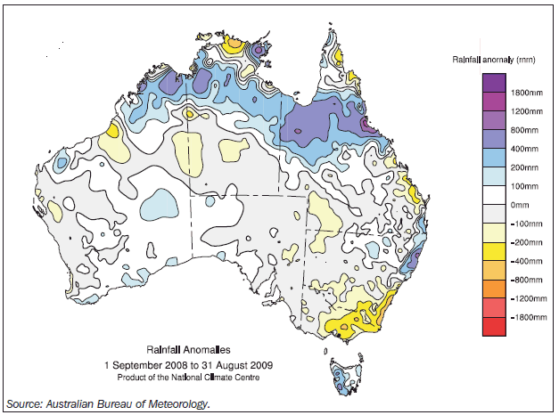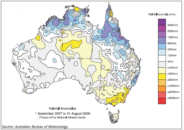 WATER Rainfall Average annual rainfall varies considerably across Australia. Large areas have average annual rainfall of 600-1,500 millimetres (mm), a range similar to most European and North American averages. But about half of the continent experiences average annual rainfall of less than 300 mm. In recent years, many parts of Australia, notably the south-east of the continent, southern Queensland, and the Murray-Darling Basin, have experienced drought conditions, with consequent lowering of water storage levels. In the 12 months from September 2008 to August 2009, highly populated areas in New South Wales and Victoria, including the Murray-Darling Basin were under stress, with below average rainfall. The south-east of Australia has been abnormally dry, while the north-east has been abnormally wet (map 3.9). The drought conditions experienced across much of Australia are evident in a two year rainfall anomaly map (map 3.10). A rainfall anomaly map shows the deviation from the annual average rainfall. According to the Bureau of Meteorology, rainfall has been below average across much of south-west and south-east Australia since 1997, while the Murray-Darling Basin has experienced below average rainfall since 2002. These are critical agricultural areas in Australia. Run-off Run-off of rainfall into water stores is affected mainly by topography, soil condition, and temperature, as follows: