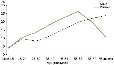 For men, the likelihood of being a carer decreased to 8% of those aged 25-34 years, but then increased with age to peak at 24% of men aged 75 years and over. Among women, the likelihood of being a carer continued to rise with age until 55-64 years (26%) and then diminished with increasing age. Older carers tend to be caring for their partner. Women generally live longer than men and tend to be younger than their male partners, so beyond 64 years are increasingly more likely than men of the same age to be widowed, and as a result, are less likely to have a partner to care for.