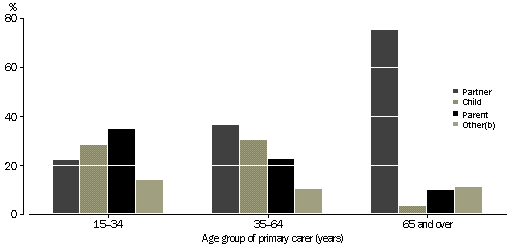 In 1998, 43% of primary carers were caring mainly for their partner, 24% for one of their parents, and 22% for one of their children. At different ages, primary carers were more likely to be caring for a particular member of their family. Those aged 15-34 years were most likely to be a parent who was the main caregiver for a child (35%), while those aged 35-64 years were most likely to be caring for their partner (36%). Similarly, three quarters of primary carers aged 65 years and over were caring for their partner.