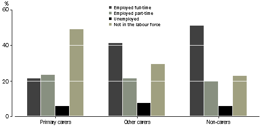 Most 15-64 year old primary carers (55%) were not employed in 1998. Nearly 6% of all primary carers of working age had left work mainly to begin to take on the role of carer to their main recipient, and had not subsequently regained employment. A further 6% of 15-64 year old primary carers were not employed, and had left their job mainly to provide additional care to their main recipient.