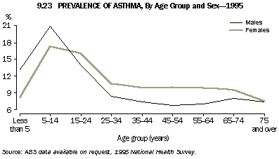 The 1995 National Health Survey estimated that 11.3% of Australians (2.04 million people) had asthma, generally as a long-term condition. This represents an increase from the prevalence in 1989-90 National Health Survey, which estimated that 8.5% of Australians had the condition. According to the Bettering the Evaluation and Care of Health (BEACH) survey, asthma is the sixth most frequently managed problem by general practitioners, accounting for 32 of every 1,000 encounters (AIHW General Practice Statistics and Classification Unit 1999). Asthma is also one of the top five reasons for doctors referring patients to hospital. During 1997-98, asthma was the principal diagnosis in 60,280 hospital separations (1.1% of all hospital separations), with an average stay of 3.5 days. The number of hospital separations increases substantially to 251,470 (or 4.5% of all separations) if both principal and additional diagnoses of asthma are included. Mortality Asthma accounted for 0.3% of deaths in Australia in 1999, when 160 males and 264 females died from the disease. As graph 9.24 shows, between 1989 and 1999 the standardised death rates due to asthma declined for males (from 5.9 to 1.7 per 100,000) and females (from 5.8 to 2.2 per 100,000). In 1999 death rates were highest for those aged 65 years and over for both males and females.