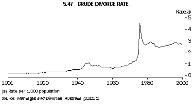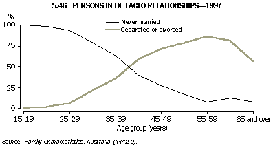 De facto marriages Between 1992 and 1997, the number of people in de facto marriages rose by 6.4% from 710,800 to 756,500 people. In 1997, de facto partners represented 9.1% of all persons living in couple relationships (up from 8.5% in 1992) and 5.3% of persons aged 15 years and over (the same as in 1992). The proportion in de facto marriages peaked among people aged 25-29. It was also high in the adjacent age groups and then fell away to lower levels with increasing age (graph 5.45). Of all de facto partners in 1997, 56% were aged 20-34. De facto partnering has arisen as an alternative living arrangement prior to, or instead of marriage, and following separation, divorce or widowhood. Some couple relationships, such as that between a boyfriend and girlfriend who live together but do not consider their relationship to be marriage-like, are classified as de facto. Of all people in de facto relationships in 1997, 69% had never been in a registered marriage, and 29% were either separated or divorced. The likelihood of being never married was higher among those aged under 35, counterbalanced by higher proportions of separated and divorced de facto partners aged 35 and over (graph 5.46). In 1997, 46% of de facto couples had children, compared with 39% in 1992. Divorces For most of the 20th century there was a slow but steady rise in the numbers of divorces granted each year, increasing from annual averages of 0.1 divorces per 1,000 population between 1901 and 1910 to 0.8 per 1,000 between 1961 and 1970. However, the most important factor involved in the higher divorce rates in the latter quarter of the century was the introduction of the Family Law Act 1975 which came into operation on 5 January 1976. This legislation allows only one ground for divorce: irretrievable breakdown of the marriage, measured as the separation of the spouses for at least one year. Following the implementation of this law, there was a large increase in the divorce rate in 1976. The rate then declined until 1979 as the backlog of applications was cleared. Since then the crude divorce rate has fluctuated between 2.4 and 2.9 divorces per 1,000 population (graph 5.47). The pattern of divorces per 1,000 married couples is very similar; in 2000 there were 12.0 divorces per 1,000 married men or women. Table 5.48 brings together summary measures of divorces granted in Census years between 1901 and 1986, and individual years between 1990 and 2000.