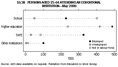 Between 1995 and 2000, the demand for education increased, as did the number of people being accepted into educational institutions. Although there was a rise in the number of enrolment applications across all age groups, there was a slight decrease in the number of people unable to get into courses (graph 10.36). While participation in education may occur at any age, many young people continue in full-time education immediately after completing compulsory schooling, either in post-compulsory schooling or within other forms of education such as VET. Some young people also return to full-time study after a period of absence some time after completing compulsory schooling. In all, 70% of 15-19 year olds at May 2000 were in full-time education (including 51% still at school). At age 20-24 years, 22% were undertaking full-time study (including less than 1% still at school) and 13% were participating in part-time tertiary study (table 10.37). Many people aged 25 years and over return to study, to upgrade their skills or to gain new skills, and often in conjunction with employment (see the article Combining work and study). The participation rate at May 2000 for people in this age group was higher for those in part-time study (6%) than for those in full-time study (2%).