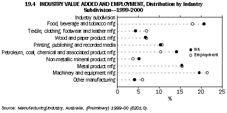 The generally direct relationship between employment and contribution to IVA is indicated in graph 19.4. The four industry subdivisions that employed 66% of the manufacturing workforce in 1999-2000, namely Machinery and equipment manufacturing; Food, beverage and tobacco manufacturing; Metal product manufacturing; and Printing, publishing and recorded media, also contributed 66% of IVA.