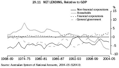 The household sector has been a net lender for most years. As a proportion of GDP, net lending by households peaked in 1974-75 at 8.3%. Since then it has trended downwards and the household sector has changed from a net lender to a net borrower. In 2004-05 household lending was -7.1%. Non-financial corporations have been net borrowers over the whole period from 1967-68 to 2004-05 (except for 1993-94), and the amounts borrowed have fluctuated significantly from year to year. As a proportion of GDP, their net borrowing was 2.9% in 2004-05.