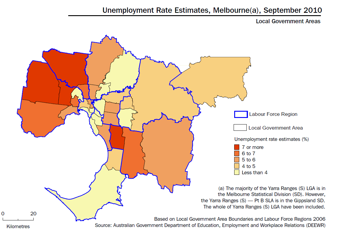 In September quarter 2010, the highest unemployment rates were recorded in the LGAs of Central Goldfields (10.9%), Greater Dandenong (10.2%), and Hume (10.0%), while the lowest unemployment rates were recorded in Nillumbik (1.8%), Stonnington (2.6%) and Bayside (2.7%).