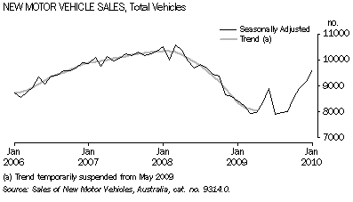 • Sales of new motor vehicles in seasonally adjusted terms increased 4.8% for the month of January 2010 and were 14.3% higher than in the same month of the previous year. This is the seventh consecutive month in which total sales have increased.
