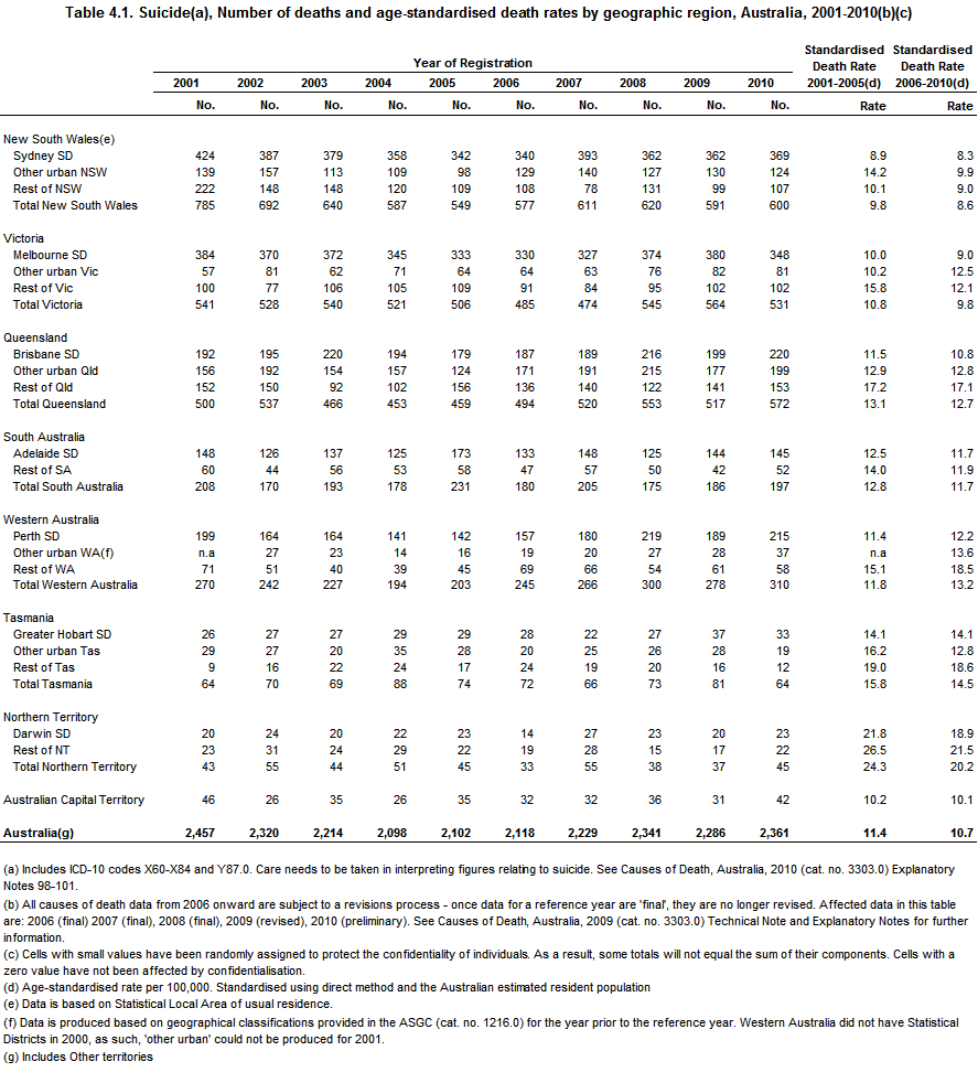 This chapter presents geographically disaggregated data for suicide deaths registered between 2001 and 2010 based on the usual state or territory of residence. Differences in the prevalence of suicide deaths across these geographic regions may help to highlight different risk factors and assist in targeting suicide prevention activities. Data in this chapter is presented by Capital City Statistical Division (SD), ‘other urban’ and ‘rest of state/territory’ regions. ‘Other urban’ areas are based on the Statistical Districts for each state or territory (generally defined as containing an urban centre population of 25,000 or more), while ‘rest of state/territory’ incorporates all Statistical Local Areas which were not included in Capital City SDs or ‘other urban’ areas. South Australia and the Northern Territory have no Statistical Districts and therefore no ‘other urban’ areas, while the Australian Capital Territory could not be further disaggregated due to small numbers of suicide deaths. DATA CUBES Further data relating to suicide deaths and geographical regions are available in the data cubes associated with this publication. These include the number of suicide deaths by capital city, other urban and rest of state by sex and age group for 2001 to 2010 combined, counts of suicide deaths by these same geographic regions by individual year and by sex, and age-standardised rates and rate ratios for 2001-2005 and 2006-2010 combined. Age-specific death rates for combined Capital City SDs and combined state and territory balances for individual reference years 2001 to 2010 are also provided. DATA QUALITY There is considerable variation between jurisdictions in the distribution of population across Capital City SDs, other urban areas and the remainder of the state/territory. As such, care should be taken in comparing counts of suicide deaths in these regions across jurisdictions. Age-specific and age-standardised death rates take into account differences in the size and structure of the population and are therefore more reliable for comparison purposes. It is acknowledged that differences exist in coronial process across jurisdictions. There are also differences in the extent to which jurisdictions record information relating to a death on the National Coroners Information System. These differences may impact the accuracy and timeliness associated with the identification of suicide deaths across jurisdictions and should be considered when making comparisons. Age-standardised death rates provided in this chapter and in the associated data cube are presented for five year aggregations (2001-2005 and 2006-2010). Aggregation of multiple years improves the reliability of the rates, and also smooths year on year variations. This should be considered when comparing rates for two aggregated time periods. Suicide and geography patterns Age-standardised death rates for states and territories over the period from 2006-2010 ranged from 8.6 deaths per 100,000 population in New South Wales, to 20.2 deaths per 100,000 population in the Northern Territory. Nationally, the age-standardised death rate over this period was 10.7 deaths per 100,000 population. The age-standardised suicide rate for the period 2006-2010 was lowest in Capital City SDs when compared with ‘other urban’ and ‘rest of state’ areas for all states and territories with the exception of Tasmania. In Tasmania the lowest age-standardised suicide rate was recorded for ‘other urban’ areas at 13.9 deaths per 100,000 population, compared to a rate of 14.1 in the Capital City SD. In contrast the age-standardised suicide rate for the period 2006-2010 was highest in ‘rest of state/territory’ areas for all states and territories with the exception of New South Wales and Victoria. Despite small numbers of suicide deaths overall, the ‘rest of territory’ area for the Northern Territory recorded the highest rate at 21.5 per 100,000 population. This was followed by ‘rest of state’ areas in Western Australia (18.5), Queensland (17.1) and Tasmania (16.3), Table 4.1 reports the number of suicide deaths per year between 2001 and 2010 for each state and territory, including Capital City SDs, and ‘other urban’ areas and ‘rest of state/territory’ where applicable. Age-standardised death rates for 2001-2005 and 2006-2010 are supplied for the same regions.