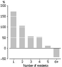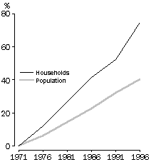 Smaller households Although the number of households has increased, the average number of residents in a household has been declining. In 1971 it was 3.3 people. Since then there has been a fairly steady decline with the 1996 Census recording an average of 2.7 people per household. Most of this difference can be attributed to the growth in the number of small households (one or two residents) and the decline in the number of large households (six or more residents). Between 1971 and 1996 the number of dwellings containing one person increased by 172% (representing a proportional change in one-person households from 14% of households in 1971 to 22% in 1996). Over the same period the number of dwellings containing six or more people declined by 45% (representing a proportional change in this size of household from 11% of households in 1971 to 4% in 1996). Although nearly half of one-person householders in 1996 were older people, they also comprised young people and middle aged people who had remained single or became single by divorce or separation. Since 1981, there has been a slight shift in age distribution away from older and younger ages (the over 60s and under 30s) towards young middle ages (30 to 44). The proportion of one-person householders aged 60 years or over decreased from 50% in 1981 to 45% in 1996. The proportion of those aged 45 to 59 years remained similar at 19% in 1981 and 20% in 1996. The proportion of one-person householders who were aged under 30 years was 14% in 1996, down from 16% in 1981. The proportion aged between 30 and 44 years was 21% in 1996, an increase from 15% in 1981. The growth in the number of one-parent families was facilitated by the introduction of the Family Law Act 1975. However, this Act only provided the mechanism for easier divorce. The social acceptability and practicality of divorce is also a product of changing social mores and the increased opportunity for women to support themselves through work or, since 1973, from the supporting mother's benefit (which was extended to male single parents in 1977 and is now incorporated into parenting payments). The reduction in the number of large households is mainly due to parents having fewer children. This is a product of both opportunity and personal choice. Women are having children at an older age than earlier generations, which reduces the maximum number of children they can possibly have. In 1964, 32% of married women who gave birth did so for their first child and 6% did so for their sixth or greater order child. In 1974, the figures were 39% for their first child and 2% for their sixth or greater order child. By 1996 these proportions were 41% for their first child and under 1.0% for their sixth or greater order child (see Australian Social Trends 1996, Trends in fertility). SIZE OF OCCUPIED PRIVATE DWELLINGS