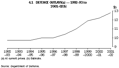 Defence spending has remained steady over the past decade, despite the end of the Cold War and a more fluid and uncertain strategic environment. As shown in graphs 4.1 and 4.2, although Defence outlays have risen gradually since 1994-95, as a percentage of GDP they declined from 1992-93 to 1996-97 before flattening out at about 2%. The White Paper Defence 2000 - Our Future Defence Force establishes that defending Australia in the 21st century will require a greater funding commitment than in the past. To that end, the Government has provided an increase in defence funding of $5.1b over four years, starting with a $507m increase in 2001-02. The military enhancements announced in the White Paper follow a major review of Australia’s defence requirements. Defence has been provided with a Capability Plan and funding projection for the development of Australia’s armed forces over the next decade. In all, defence spending over the next ten years is forecast to increase by a total of $27.6b, averaging around 3% per annum growth in real terms, bringing total spending over the period to around $160b. Graph 4.3 reflects the importance of people to Australia’s defence capability. It also shows an increased commitment to investment (capital outlays) in the late 1990s, which mainly comprises the purchase of specialist military equipment (the so-called ‘sharp end’ of defence). In the meantime, 'operating' expenditure has declined as a percentage of defence expenditure. Over the past decade, defence spending by Australia’s traditional strategic partners, the United States and the United Kingdom, has declined steadily with the end of the Cold War and the subsequent reduction of their military forces. The United States’ defence spending as a percentage of GDP has declined from 5% to 3%, and the United Kingdom’s spending as a percentage of GDP has dropped from 4% to 2.5%. Australia has spent less on defence as a percentage of GDP than either of these countries. From a regional perspective, Australia has tended to spend more on defence than its neighbours. Key regional players, such as Indonesia, Thailand, Malaysia, Singapore, the Philippines and New Zealand, all spend less than Australia. Table 4.4 compares Australia's defence spending with that by key South-East Asian countries during the 1990s.