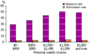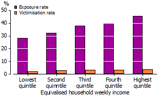 SCAMS SCAM EXPOSURE AND VICTIMISATION RATES BY AGE(a) (a) Rates are calculated as a percentage of total persons in each demographic sub-population MARITAL STATUS AND COUNTRY OF BIRTH Both the exposure rate and the victimisation rate for scams was higher for married persons than unmarried persons (39.4% compared to 30.3% for exposure, and 3.2% compared to 2.5% for victimisation). Exposure to scams was higher for persons born in Australia than persons born overseas (36.5% compared to 34.1%), although there was no statistically significant difference in the victimisation rate (3.0% and 2.8%). LABOUR FORCE STATUS AND EDUCATION ATTAINMENT Employed persons were more likely to be exposed to a scam than unemployed persons (39.5% compared to 34.5%), however both were more likely to be exposed than persons not in the labour force (28.4%). In terms of victimisation, employed persons were more likely to be victims than persons not in the labour force (3.2% compared to 2.1%). Persons with a degree, diploma, or higher education were more likely to be exposed to a scam than persons with other non-school qualifications (44.8 % compared to 37.7%), however both were more likely to be exposed than persons with no non-school qualification (28.3%). Persons with a degree, diploma, or higher education and persons with other non-school qualifications were also more likely to be victims than persons with no non-school qualification (3.6% and 3.2% compared to 2.3%). PERSONAL AND HOUSEHOLD WEEKLY INCOME In terms of personal weekly income, persons earning $1,500–$1,999 and $2,000 and over were more likely to be exposed to a scam (50.8% and 48.9%) than persons earning less than these amounts. Persons earning $1,500–$1,999 were also more likely to be a victim of a scam than persons earning $0-$499 (4.0% compared to 2.6%). SCAM EXPOSURE AND VICTIMISATION RATES BY PERSONAL WEEKLY INCOME(a) (a) Rates are calculated as a percentage of total persons in each demographic sub-population Persons in the highest quintile of equivalised household weekly income were more likely to be exposed to a scam (45.7%) than persons in the other quintiles. Persons in the lowest quintile were less likely to be a victim (2.3%) than persons in the third (3.5%), fourth (3.4%), and highest (3.7%) quintiles. SCAM EXPOSURE AND VICTIMISATION RATES BY EQUIVALISED HOUSEHOLD WEEKLY INCOME(a)(b) (a) Rates are calculated as a percentage of total persons in each demographic sub-population (b) For information on equivalised household weekly income, see Explanatory Notes 32–36
