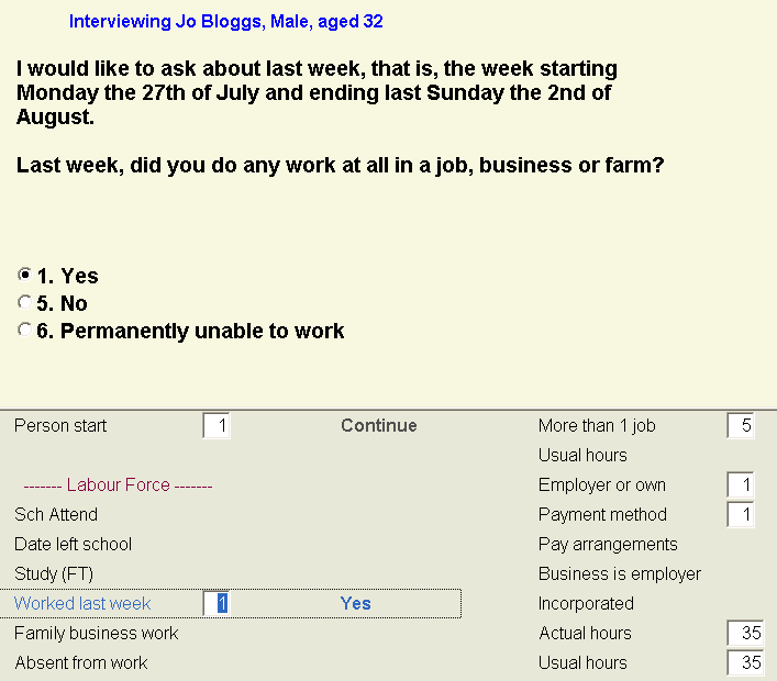 Layout Horizontal and vertical layouts Default horizontal layout This is the default Blaise layout and is the standard format used for household survey CAI instruments. A horizontal line separates the Information Pane and the Form Pane (see Diagram 5). One question appears on the screen at a time in the information pane. This layout is suitable for surveys which have many yes/no answers, multiple choice pick-lists, and automatic sequencing. Diagram 5. Horizontal screen layout Alternative horizontal layout For horizontal layouts that require historical data to be displayed in columns, the alternative horizontal layout is suitable. The form pane (rather than the information pane) contains the answer choices (see Diagram 6). Diagram 6: Alternative horizontal layout for CATIs displaying historical data Vertical layout In this layout, the questions are on the left of the screen and the answer fields are on the right, allowing more than one question to appear on the screen at a time (see Diagram 7). The vertical layout is not suitable for forms that have a large amount of sequencing as skipped questions cannot be 'hidden'. The questions should be visible without scrolling. Diagram 7. Vertical screen layout The screen layout should be as simple and uncluttered as possible. There should be top and left margins of about 5mm in the information pane and form pane. Back to top Screen colours For CATIs using the horizontal layout, the standard is pale yellow for the information pane background and light grey for the field pane. For the vertical layout, the current standard is for all parts of the screen to be light grey. Questions and responses If there is a self-administered form which the respondent is referring to, there should be question numbers in the CAI instrument which match the question numbers used in the paper form. If the CAI instrument requires additional questions that are not on the paper form, the extra questions should be given an alphanumeric identifier (e.g. two additional questions between questions 5 and 6 would be labelled 5a and 5b). Below the instructions should be an indicator relating to other notes or help which may be available. The lines of question text should be about 60 characters wide, leaving some blank space to the right. There may also be completion instructions for the interviewer. All of this information needs to fit on one screen. The interviewer should never have to scroll the information pane to see everything. When the whole question will not fit it should be split somehow or use a pop-up. Form pane fields should have a short label which is meaningful enough to recognise the question it belongs to. Diagram 8. Labels for response fields in form pane For the horizontal layout, the response fields should be laid out in columns, with appropriate headings (referring to Part titles etc.) when necessary. Field lists which go to two columns need to be balanced so that there is roughly the same number of fields in each column. Response fields for the vertical layout appear as a single list in the column adjacent to the question. It is important that the field labels are kept brief, so that interviewers don't mistake the field text for the actual question. The field space should be to the right of the field label. Where text responses are entered, the field space should extend across the screen as far as generally required. Small scrolling fields should not be used and pop-up text boxes should only be used where a great deal of text is possible (e.g. "comments" question in business survey CATIs). Screens containing no questions Screens which do not include a question (e.g. "Select 3 to continue") should be avoided as much as possible. If it must be used, the screen should be designed to be consistent with the other screens, so that the instructions appear in roughly the same location on each screen. Historical data Historical data can be displayed using both the horizontal and vertical layouts, in column format in the form pane. Each column should have a descriptive heading so that it is clear which reference period it refers to (e.g. Diagram 9). Diagram 9: Columns displaying historical data When only a single response from the previous reporting period is required to be displayed, an option is to have it appear as text in the information pane (e.g. Diagram 10). Diagram 10: Alternative display of historical data Historical data is generally not able to be amended by the interviewer. Back to top Parallel blocks The CAI instrument interface is made up of "parallel blocks" represented by worksheet-like tabs (e.g. Diagram 11). The order of the parallel blocks should be kept consistent across surveys, so that interviewers know where to find them (e.g. the "Exit form" block used in business survey CATIs should appear last). Diagram 11. Tabs of parallel blocks Question Structure (See CAI Interface Design Standards for information on introductions, question wording, explanatory notes and scales/measurement units). Running prompt questions For running prompt questions, the following instructions should appear in blue text below the question and before the response options: