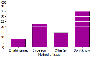 The most common known way that victims' personal details were obtained in the commission of identity theft was in person (28.3% of victims), followed by email/internet (10.0%), although nearly half of all victims (44.0%) reported that they did not know how their personal details were obtained.