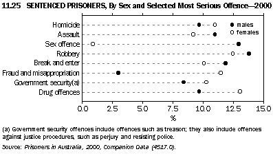 Differences between men and women in the prison system extend beyond the fact that there were 16 male prisoners for every female prisoner. There were also some differences in the types of offences for which men and women were imprisoned, reflecting the differences in the patterns of offending between men and women. Graph 11.25 shows that the most common offences for males in 2000 were robbery (14%), sex offences (13%), break and enter (12%) and assault (11%). In the case of female prisoners, nearly half (48%) of the most serious offences were accounted for by drug offences (13%), robbery (13%), fraud and misappropriation (12%) and government security offences (10%).