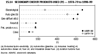 Natural gas has been the fastest growing primary energy over the twenty years 1978-79 to 1998-99 (graph 15.13). The growth rate for coal (black and brown) has also been above the overall trend, due primarily to the strong growth in electricity generation over the period (graph 15.14). The consumption of crude oil has also grown significantly, reflecting the heavy use of petroleum products in the transport sector. The annual growth in consumption of renewables has declined over the years (ANZMEC 2001).