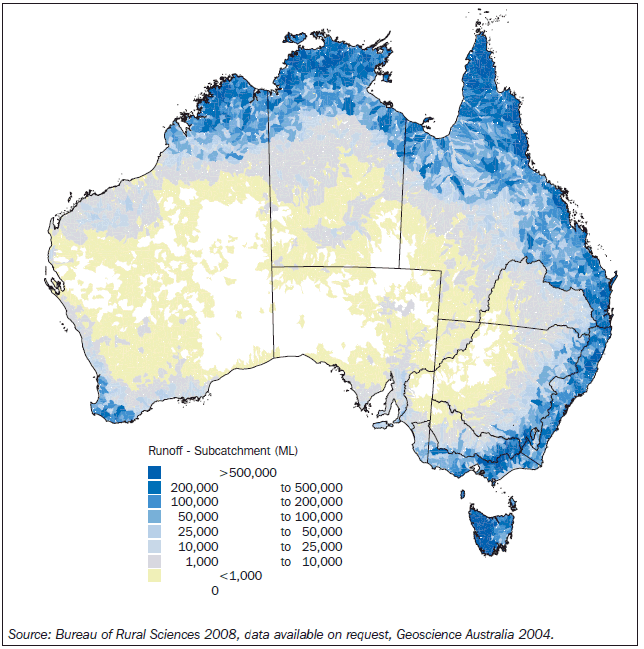 WATER Rainfall Average annual rainfall varies considerably across Australia. Large areas have average annual rainfall of 600-1,500 millimetres (mm), a range similar to most European and North American averages. But about half of the continent experiences average annual rainfall of less than 300 mm. In recent years, many parts of Australia, notably the south-east of the continent, southern Queensland, and the Murray-Darling Basin, have experienced drought conditions, with consequent lowering of water storage levels. In the 12 months from September 2008 to August 2009, highly populated areas in New South Wales and Victoria, including the Murray-Darling Basin were under stress, with below average rainfall. The south-east of Australia has been abnormally dry, while the north-east has been abnormally wet (map 3.9). The drought conditions experienced across much of Australia are evident in a two year rainfall anomaly map (map 3.10). A rainfall anomaly map shows the deviation from the annual average rainfall. According to the Bureau of Meteorology, rainfall has been below average across much of south-west and south-east Australia since 1997, while the Murray-Darling Basin has experienced below average rainfall since 2002. These are critical agricultural areas in Australia. Run-off Run-off of rainfall into water stores is affected mainly by topography, soil condition, and temperature, as follows: