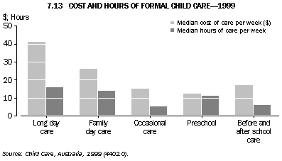 The cost of child care varies considerably according to type of care and hours used. In 1999, the median weekly cost to families using formal child care was $22 per child (graph 7.13). The majority of these families (79%) used fewer than 20 hours of care per week.