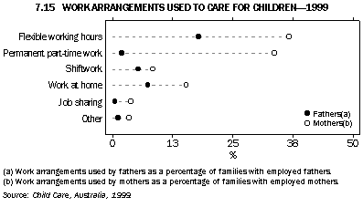 Increasingly, employers acknowledge the need for workers to balance work and family responsibilities, and have introduced a range of provisions over the years to help families do this. These provisions include flexible working hours, permanent part-time work, home-based work and job sharing. In 1999, over half (53%) of families with children aged under 12 years, and with at least one parent employed, used one or more arrangements based on these provisions to help them care for children (table 7.14).