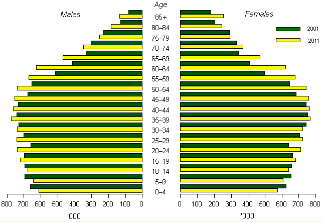 Population by age and sex, Australia, 2001 and 2011