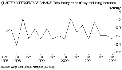 The Wage Cost Index (WCI) was compiled for the first time for the December quarter 1997 (with a base of September quarter 1997 = 100.0). For the June quarter 2002, the total hourly rates of pay excluding bonuses index for Australia was 115.9, reflecting quarterly growth from March quarter 2002 of 0.6% and annual growth of 3.1%.
