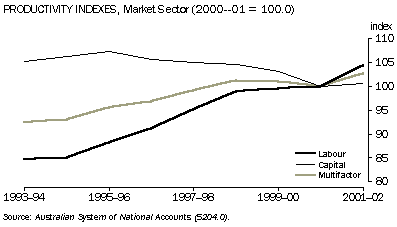 The average annual growth rate between the latest two 'growth cycle' peaks (see explanatory notes below) in 1993-94 and 1998-99 was 1.8% for multifactor productivity, 3.2% for labour productivity and -0.1% for capital productivity. The growth rate for multifactor productivity over the latest cycle is higher than for any preceding cycle since multifactor productivity was first measured in respect of 1964-65.