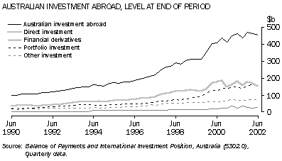 Over the period 30 June 1997 to 30 June 2002, financial derivatives increased 224% (from $9.3b at 30 June 1997 to $30.0b at June 2002) portfolio investment increased 160% (from $61.2b at to $159.3b), direct investment increased 72% (from $89.0b to $153.4b), other investment assets 88% (from $39.3b to $73.8b) and reserve assets 65% (from $22.8b to $37.4b).