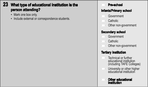 This variable identifies the type of educational institution being attended by people who are full/part-time students. The categories cover pre-school through to tertiary institutions.