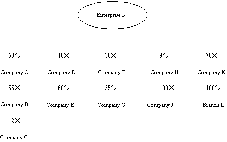 B is a subsidiary of A and therefore a subsidiary of N, even though only 33 per cent (60% x 55%) of B’s capital is indirectly attributable to N;