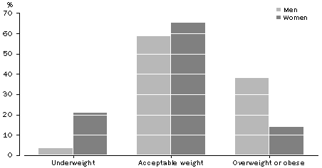 Overweight and obesity In general, excess body weight is the outcome of a long-term imbalance between energy intake and energy expenditure. The extent to which people are overweight or obese can be measured by the body mass index (BMI). In 1995 BMI measures of Australians aged over 18 indicated that 57% were overweight or obese. Men were more likely than women to be overweight or obese at every age. Even though being overweight or obese was more of a health risk for men, women were generally more concerned about their body weight and diet. Women were more likely than men to be on a weight-reduction or fat-modified diet (24% compared to 16%). Also, of those who consider themselves to be within an acceptable weight range, women were seven times more likely than men to be underweight (21% compared to 3%) and men were nearly three times more likely than women to be overweight or obese (38% compared to 14%).
