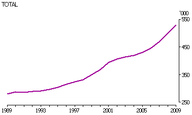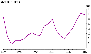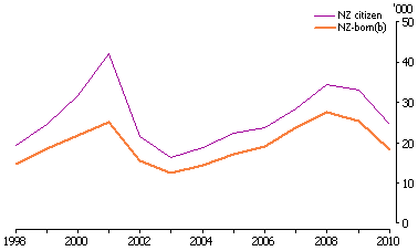 NEW ZEALANDERS IN AUSTRALIA The number of NZ-born people living in Australia increased by 89% over the last two decades, from 280,200 in 1989 to 529,200 in 2009. Annual growth in the number of NZ-born people living in Australia averaged 13,100 between 1989 to 2009. However, from year to year there have been variations in annual growth, with increases exceeding 25,000 on four occasions (1989, 2001, 2008 and 2009), and negative growth in 1991 (-860). This decrease coincided with the early 1990s recession within Australia, which may have discouraged some NZ-born people from coming to Australia, and prompted others to return 'home'. NZ-BORN PEOPLE LIVING IN AUSTRALIA - 1989-2009(a) (a) At 30 June. Source: ABS Migration, Australia (cat. no. 3412.0) Between 1989 and 2009, the proportion of NZ-born people in Australia's estimated resident population (ERP) increased from 1.7% to 2.4%. This makes New Zealand the second largest single country contributor to Australia's overseas-born population (the United Kingdom is the largest contributor at 5.4% of ERP). In 2009, the proportion of the Australian population that was born in China (1.6%) or India (1.4%) were both smaller than the New Zealand share. Nonetheless, in recent years there has been very strong growth in both China-born and India-born Australian residents (see Australian Social Trends September 2009 'Expanding links with China and India'). Compared with the other contributor countries of migrants, New Zealand has a relatively small population, with an estimated 3.0 million NZ-born people living in New Zealand in 2006. (Endnote 1) This means that for every 100 New Zealanders in New Zealand in 2006 there were 15 NZ-born people living in Australia. The annual change in the size of the NZ-born population in Australia tends to hide the two-way movement of the NZ-born population. Although there was a net migration of 94,300 NZ-born people to Australia between 2005 and 2008, this included 156,000 NZ-born arrivals and 61,500 NZ-born departures. Of those who departed in this period, around one-third (32%) had been resident in Australia for less than two years, while over half (58%) had been here for less than five years. Despite the relative fluidity of migration to and from Australia by NZ-born people, the majority have been living here for a decade or more. The 2006 Census of Population and Housing showed that 65% of Australia's NZ-born population had been in Australia since 1996, including 41% who had been here since 1986. In addition to longer-term migratory movements of the NZ-born population, a large number of them are frequent flyers back to New Zealand on short-term trips. In 2009-10 there were 297,000 departures of NZ-born residents of Australia back to New Zealand for a period of less than 12 months. This was equivalent to 56 departures for every 100 NZ-born people living in Australia (for more information see Australian Social Trends, September 2010, 'Holidaying abroad').