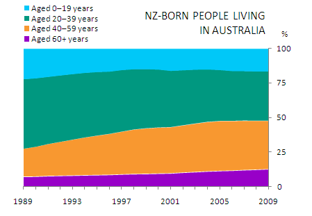 PROFILE More likely to be middle-aged In 2009, the NZ-born population living in Australia had a higher proportion of people in the 20-59 years age group than the Australian population in general (71% compared with 55%). In contrast, children and adolescents (aged 0-19 years) made up a lower proportion of the NZ-born population living in Australia (17%), compared with the overall Australian population (26%). This was also the case with the older age group of those aged 60 years and over (13% compared with 18%). Between 1989 and 2009, the Australian population aged as the proportion of people in the younger age groups decreased and those in the older age groups increased. This ageing process was much more dramatic among the NZ-born population living in Australia. While one-half (50%) of NZ-born people living in Australia were aged 20-39 years in 1989, only 36% were of this age in 2009. Over the same period, NZ-born people aged 40-59 years living in Australia increased from 20% to 35%. This changing age structure was reflected in the median age of the NZ-born population increasing from 30.6 years to 39.0 years over the past two decades. The more rapid ageing of the NZ-born population in Australia can be partly attributed to the change over time in the age of arrivals from New Zealand. Of all arrivals of NZ-born people into Australia in the five years to 1989, 11% were aged 40 years and over. This proportion had grown to 21% in the five years to 2009. Another contributing factor is that children born to New Zealanders while they are living in Australia do not influence the age structure of the NZ-born population in Australia. AGE STRUCUTRE OF THE POPULATION(a) (a) At 30 June. Source: ABS Migration, Australia (cat. no. 3412.0) More likely to be male Among NZ-born people living in Australia, there were more males than females, with 106 NZ-born males for every 100 NZ-born females. This contrasts with the overall sex ratio for Australia of 99 males per 100 females. Maori and other ancestries The 2006 Census of Population and Housing asked people about their ancestry. (Endnote 2) Of NZ-born people living in Australia, 15% stated Maori ancestry. This was similar to the rate in New Zealand, where 16% of people usually living in New Zealand said that they are of Maori descent. (Endnote 3) Almost two-thirds of NZ-born people living in Australia stated that they had European ancestry (65%). One-fifth reported having ancestry of 'New Zealander' or 'New Zealand peoples', while a small proportion stated Polynesian ancestry (6.0%). Partnering up In 2006, just over three-fifths (62%) of NZ-born people aged 15 years and over living in Australia were in a couple relationship, slightly higher than the general Australian population (59%). In around one-quarter (26%) of couple relationships involving a person of NZ birth, the second person was also of NZ birth. It was more common for both partners to be NZ-born in relationships between older people than among younger couples (34% where both were aged 60 years and over, and 22% where both were aged under 40 years). WHERE DO THEY LIVE? In 1986, the majority of NZ-born Australians were living in New South Wales or Queensland (35% and 28% respectively). While these two states still held the majority of NZ-born people living in Australia in 2006, Queensland overtook New South Wales as their most popular state of usual residence (38% in Queensland and 27% in New South Wales). NZ-born residents were almost twice as likely as the overall population to live in Queensland in 2006 (38% compared with 20%). In particular, they were just over twice as likely to live in Brisbane and more than three times as likely to live on the Gold Coast. In 2006, there were several Statistical Local Areas on the Gold Coast where around one in ten residents were of NZ birth, the result of strong growth in the NZ-born population living in this region. These areas were Pacific Pines-Gaven and Surfers Paradise (both 11%), and Coombabah, Kingsholme-Upper Coomera, Broadbeach-Mermaid Beach and Robina (all 10%). NZ-born people were also slightly more likely than the overall population to live in Western Australia (12% compared with 10%). PLACE OF USUAL RESIDENCE(a) - 1986 AND 2006