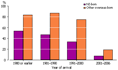 Source: ABS 2009-10 Labour Force Survey Study Education participation rates of young NZ-born people (obtained from the 2009 Survey of Education and Work) are lower than among young Australians generally. Among those aged 18-24 years who were not still at school, the NZ-born were half as likely as the overall population to be enrolled in study (22% compared with 44%). Furthermore, around one in ten (12%) young NZ-born people were studying full-time compared with around one in three (32%) young people generally. In 2009, NZ-born people aged 25-64 years had the same rate of attainment of a non-school qualification as the overall Australian population (both 62%). These similar attainment rates, together with NZ-born people in Australia having lower rates of participation in study, suggest they have a tendency to complete their studies prior to migrating to Australia. However, NZ-born people tend to have a slightly different skills profile to the general Australian population. It was more common for 25-64 year old NZ-born people to have an advanced diploma or lower as their highest non-school qualification (39%), compared with the overall Australian population (34%). Around one in five (19%) NZ-born people aged 25-64 years had a Certificate III or IV. NZ-born Australians aged 25-64 years were less likely than Australians in general to have a bachelor degree or higher (22% compared with 27%). Information from the 2006 Census of Population and Housing suggest that recent NZ-born migrants are more likely than previous NZ-born migrants to have a bachelor degree or higher. Around one in four (23%) 25-64 year old NZ-born people, who arrived in Australia in 2002 or later, had a bachelor degree or higher as their highest non-school qualification. In contrast, around one in five (18%) of those who had arrived in Australia between 1997 and 2001 had a bachelor degree or higher, as did 16% of those who arrived prior to 1997. BECOMING AUSTRALIAN CITIZENS NZ-born people living in Australia are less likely to become Australian citizens than other overseas-born Australian residents. Of the NZ-born population counted in the 2006 Census of Population and Housing, 37% had Australian citizenship. In contrast, 71% of people who were born in other countries (excluding Australia) were Australian citizens. The high rate of movements back and forth between New Zealand and Australia may contribute to this low rate of citizenship. For example, the Census may count people living in Australia who do not consider taking up citizenship because they plan on moving back to New Zealand in the longer term. The low rate of citizenship may also be influenced by NZ-born people not having the same incentives to seek Australian citizenship as people from other countries, because their New Zealand citizenship provides them with certain benefits within Australia. For example, New Zealand citizens who migrated to Australia prior to 27 February 2001 are eligible for certain social security payments from the Australian government without needing to apply for Australian permanent residency or citizenship, unlike other migrants to Australia. Nevertheless, NZ-born people living in Australia, like any migrant population, are more likely to become Australian citizens the longer they have lived here. Over half (54%) of those who had arrived in 1980 or before had obtained Australian citizenship by 2006, while only 7.7% of those who arrived in 2001 or later had become Australian citizens. AUSTRALIAN CITIZENSHIP OF OVERSEAS-BORN RESIDENTS, BY YEAR OF ARRIVAL - 2006 Source: ABS 2006 Census of Population and Housing ENDNOTES 1. Statistics New Zealand, 2006, Quickstats About Culture and Identity - Tables,viewed 27 August 2010, <www.stats.govt.nz>.2. People could put a maximum of two ancestries on their Census form.3. Statistics New Zealand, 2006, Quickstats About Maori, viewed 22 March 2010, <www.stats.govt.nz>. Please direct all statistical enquiries to the National Information and Referral Services (NIRS) by emailing client.services@abs.gov.au Articles in Australian Social Trends are designed to provide an overview of a current social issue. We aim to present an interesting and easy-to-read story, balanced with appropriate statistics. The articles are written as a starting point or summary of the issues, for a wide audience including policy makers, researchers, journalists and people who just want to have a better understanding of a topic. For people who need further information, we provide references to other useful and more detailed sources. Tell us if we are achieving this aim by emailing social.reporting@abs.gov.au Document Selection These documents will be presented in a new window.