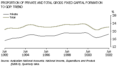 Over the last ten years the proportion of private gross fixed capital formation (investment) to GDP in quarterly trend terms rose from 15.2% in June quarter 1992 to a high of 19.2% in March quarter 2000, and was 18.5% in the June quarter 2002. Changes in the proportion of total gross fixed capital formation to GDP largely reflect movements in private sector investment.