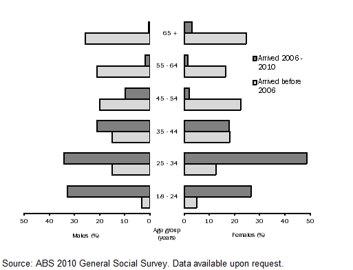 Age and sex A greater proportion of migrants who arrived before 2006 were aged 45 years or older whereas migrants who arrived 2006 to 2010 had a larger proportion of people aged 18 years to 44 years of age. As can be seen in the graph below, the age structures for males and females of the two migrant groups appear to be quite different. Two thirds (67%) of males who arrived in Australia before 2006 were aged 45 or older, whereas 67% of males who arrived between 2006 and 2010 were aged 18 to 34 years of age. For females who arrived in Australia before 2006, 82% were aged 35 years of age or older whereas 75% of females who arrived in Australia between 2006 and 2010 were aged between 18 to 34 years of age. One explanation of the difference in age structures of the two groups is that most newly arrived migrants are partly selected on the basis of their age, health and, for some, their relatively high socioeconomic status (Endnote 5). The earlier arrival group of migrants may also been selected on 'age based' criteria when they first arrived in Australia, however, given the length of time since their arrival, they are now older. Age and Sex, By Year of Arrival As would be expected, the number of migrants in the 'Arrived before 2006' group is larger than the 2006 to 2010 group as it constitutes a far longer period of time. This is illustrated in the table below. For this reason, the rest of the article refers to proportions rather than the numbers.