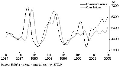 Non-residential construction activity has shown a similar pattern whereby peaks in building completions have lagged behind commencements. It took a long time for non-residential building work to be completed after commencements peaked in September 2002 and commencements were relatively subdued until early 2005. Given that skills shortages were being experienced by the construction industry during this period, it appears to have had an impact on lengthening of the lag between commencements and completions.