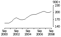 In the September quarter 2008, the trend estimate for beef production increased by 1% to 540 thousand tonnes. MUTTON AND LAMB In the September quarter 2008 the trend estimate for mutton production remained steady at 66 thousand tonnes. The trend estimate for lamb production this quarter fell by 4% to 98 thousand tonnes. TOTAL RED MEAT The trend estimate for total red meat production fell marginally to 795 thousand tonnes in the September quarter 2008. CHICKEN MEAT The trend estimate for chicken meat production in the September quarter 2008 increased by 2% to 205 thousand tonnes. Document Selection These documents will be presented in a new window.